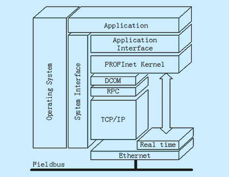 PROFInet設(shè)備的軟件覆蓋了現(xiàn)場設(shè)備的整個運行期通信,基于模塊化設(shè)計的軟件包含若干通信層,每層都與系統(tǒng)環(huán)境一致。PROFInet軟件主要包括一個RPC(Remote Procedure Call)層,一個DCOM(Distributed Component Object Model)層和一個專門為PROFInet對象定義的層。PROFInet對象可以是ACCO(Active Connection Control Object)設(shè)備、RT auto(Runtime Automation)設(shè)備、物理設(shè)備或邏輯設(shè)備。軟件中定義的實時數(shù)據(jù)通道提供PROFInet對象與以太網(wǎng)間的實時通信服務(wù)。PROFInet通過系統(tǒng)接口連接到操作系統(tǒng)(如WinCE),通過應(yīng)用接口連接到控制器(如PLC)。