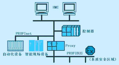 PROFInet不僅可以應(yīng)用于分布式智能控制,而且還逐漸進入到過程自動化領(lǐng)域。在過程自動化領(lǐng)域,PROFInet針對工業(yè)以太網(wǎng)總線供電以及以太網(wǎng)本質(zhì)在安全領(lǐng)域應(yīng)用的問題正在形成標(biāo)準(zhǔn)或解決方案,采用PROFInet集成的PROFIBUS現(xiàn)場總線可以為過程自動化工業(yè)提供優(yōu)越的解決方案(如圖5所示):