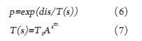 在每一輪進(jìn)化完成后都需要決定進(jìn)入下一輪進(jìn)化的種群。如果過(guò)多地將較優(yōu)種群作為父代,就會(huì)使算法過(guò)早收斂或搜索緩慢。文獻(xiàn)[7]中指出模擬退火算法能夠以一定的概率接受劣解從而跳出局部極值區(qū)域并最終趨于全局最優(yōu)解,因此可以將上文提到的最優(yōu)適應(yīng)度增幅比作為能量函數(shù),運(yùn)用模擬退火的Meteopolis準(zhǔn)則來(lái)選擇待進(jìn)化的種群。為了使每個(gè)種群得到充分地進(jìn)化,預(yù)防最優(yōu)解的丟失,這里采用設(shè)置退火步長(zhǎng)的策略來(lái)實(shí)現(xiàn)模擬退火選群。該策略具體為:使退火步長(zhǎng)對(duì)同一種群作為父代的次數(shù)進(jìn)行計(jì)數(shù),一旦產(chǎn)生更優(yōu)種群則退火步長(zhǎng)就置零并重新計(jì)數(shù)。若退火步長(zhǎng)累計(jì)超過(guò)一定的閾值時(shí),就進(jìn)入模擬退火選群階段。退火步長(zhǎng)累計(jì)到一定數(shù)量意味著原有種群的進(jìn)化已經(jīng)停滯,需要用模擬退火算法擺脫這種停滯狀態(tài)。如果增幅比大于零,則說(shuō)明新生種群優(yōu)于原有種群,這時(shí)完全接受新種群進(jìn)入下一輪進(jìn)化;否則新生種群劣于原有種群,并以一定的概率p接受較劣的新生種群[8]進(jìn)入下一輪進(jìn)化。接受概率p由式(6)和式(7)共同決定,其中dis為增幅比,T(s)指溫度參數(shù),T0和s分別是初始溫度和迭代次數(shù)。