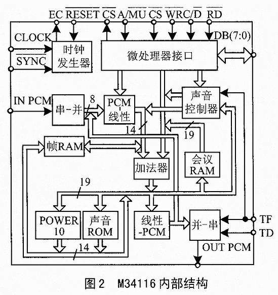 當系統(tǒng)組織一個電話會議時,參加會議的任一臺話機接口的輸出信號都必須同時送到其余所有話機接接收端。換而言之,會議中每一個接口的接收端所收到的信號就是除本身外其余所有話機接口輸出的模擬話音信號的疊加。在數(shù)字交換中,由于話音信號的二進制非線性編碼(A/μ律)特性,不允許將來自若干路接二進信號簡單地相加。圖2為M34116內(nèi)部結構圖。會議芯片須占用一對母線,交換網(wǎng)輸出的PCM信號由芯片的PCM I愼腳輸入,經(jīng)串-并變換后,輸入線性化電路。線性化后的各引時隙(抽樣)加上控制系統(tǒng)端口的衰減或增益電平被送入加法器相加,加完后的結果通過POWER 10再線性化后送入幀RAM中。哪些時隙構成一個會議,由控制系統(tǒng)經(jīng)數(shù)據(jù)總線中口寫入。當一個接口發(fā)起一個會議時,控制系統(tǒng)為該會議編排一個1~29的編號。此后,其它接噪中根據(jù)需要加入已經(jīng)存在會議,或重新組織另一個會議。控制系統(tǒng)由數(shù)據(jù)總線口將各會議的編號及參加每個會議的各時隙的編號寫入會議RAM中,地加法器對各信號正確地組合相加。加法器輸出的信號經(jīng)非線性化電路還原為A/μ律編碼信號,最后有并一串變換電路恢復為串行輸出,送往對應的交換網(wǎng)絡PCM輸入總線。