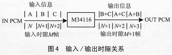 M34116是專為PCM數(shù)字交換應用而設計的器件,能匯接64方會議和最多29組會議。M34116與交換網(wǎng)絡、微處理器連接中圖3所法。交換網(wǎng)可以采用M3488或MT8980D等數(shù)字交換網(wǎng)絡。經(jīng)過PCM編碼后,其輸出時隙比輸入時隙延時一個幀(加一個時隙),因此,做會議接續(xù)時應延時一個時隙。輸入、輸出關系如圖4所示。M34116對每種工作模式的每一通道具有可編程衰減 或增益控制,輸入/輸出的范圍均為±15dB。