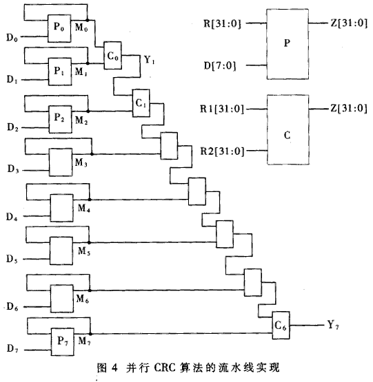 矩陣法和代入法本質上都是設計直接并行編碼電路的方法,二者的最終效果是一樣的。直接并行實現(xiàn)的CRC編碼電路控制邏輯比較簡單,但是需要進行復雜的組合邏輯運算。為了在更高頻率下進行并行CRC編碼,可以進一步用流水線的方法簡化編碼邏輯,所付出的代價是整個幀的處理延遲了8個時鐘周期。圖4給出了CRC編碼的流水線實現(xiàn)。將并行輸入的64比特分成7個字節(jié),分別用D0、D1、……、D7表示。P模塊(P0~P7)計算形如"Di,O,O,O,O,O,O,O,Di"的序列的CRC,其中Diˊ,是Di位置上的上一次輸入。Diˊ的CRC碼由端口R[31:0]輸入,Di由端口D[7:0]輸入,結果由Z[31:0]端口輸出。