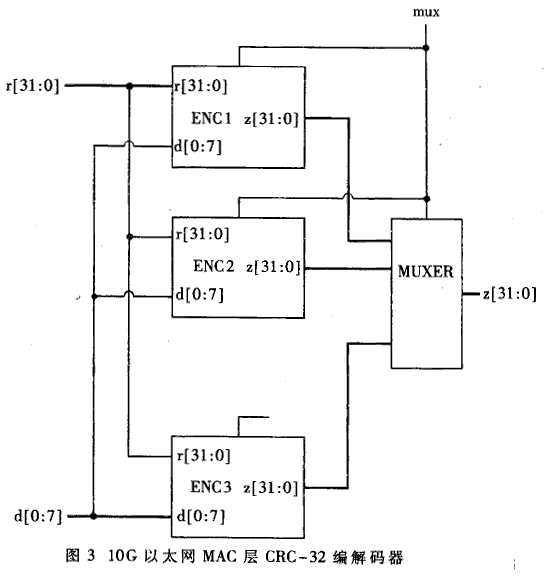 10G以太網(wǎng)接入系統(tǒng)中需要采用并行CRC編碼器。本文提出了基于組合邏輯的直接實現(xiàn)和基于流水線的實現(xiàn)方法。其中直接實現(xiàn)的方法又分為矩陣法和代入法兩種。經(jīng)過具體推導發(fā)現(xiàn)直接實現(xiàn)的編碼器可以滿足延時要求,因而被本系統(tǒng)所采用。而基于流水線的設計因為其延時較小,可以用于更高速的場合。本文提出的三種并行化設計方法已經(jīng)通過了硬件驗證。這些設計思想同樣適用于其他線性移位寄存器,如擾碼器的設計。