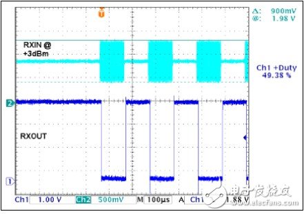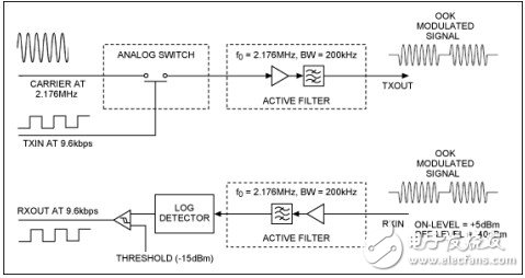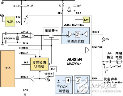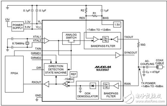 MAX9947接收器提供20dB典型動(dòng)態(tài)范圍,集成帶通濾波器,濾波器工作在2.176MHz,具有較窄的200kHz帶寬。