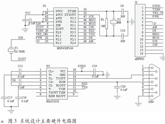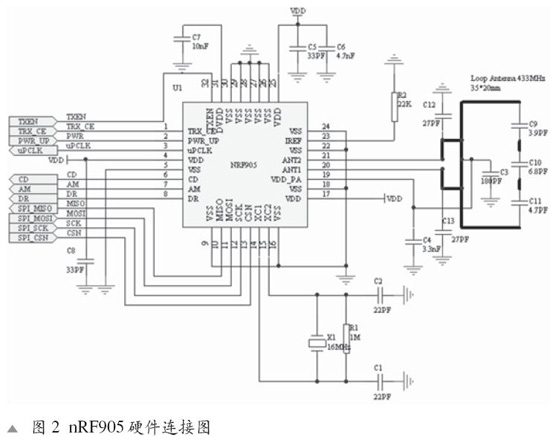 引腳上。ADC0832 使用SPI 串行接口與單片機(jī)進(jìn)行通信,電源電壓為+5 V,去耦電容C 為0.1 μF,硬件電路如圖3所示。 2.2 NRF905無線通信 無線通信模塊采用單片433