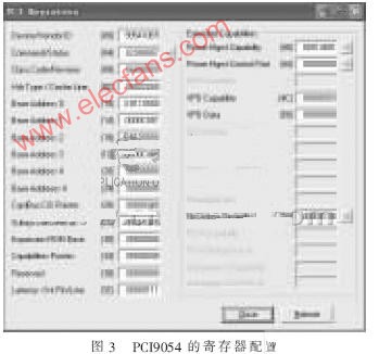 PXI接口電路利用PCI9054芯片構(gòu)造PCI接口。PCI9054由PCI總線接口邏輯、本地總線接口邏輯、內(nèi)部邏輯和EEPROM接口邏輯組成。本地接口邏輯由可編程邏輯器件實(shí)現(xiàn),包括地址/數(shù)據(jù)信號(hào)、I/O讀寫信號(hào)、存儲(chǔ)器讀寫控制信號(hào)以及等待周期產(chǎn)生邏輯和總線控制邏輯等[3]。串行EEPROM采用93CS56芯片,在EEPROM中,按順序存儲(chǔ)接口卡最重要的配置信息。將板卡連接到PXI插槽后,在系統(tǒng)上電時(shí),PCI9054首先檢查到EEPROM,然后按照EEPROM中的值配置其內(nèi)部寄存器。圖3是PCI9054寄存器的配置信息。