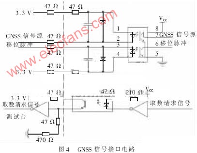 測(cè)量綜合控制器測(cè)試臺(tái)中,GNSS信號(hào)源模擬GNSS接收機(jī)。信號(hào)源的準(zhǔn)確性有利于測(cè)量綜合控制器性能的測(cè)量。測(cè)量綜合控制器GNSS模塊在每幀的開始利用幀同步脈沖向GNSS接收機(jī)發(fā)出取數(shù)請(qǐng)求信號(hào),GNSS接收機(jī)接到請(qǐng)求后,在8 ms內(nèi)向遙測(cè)設(shè)備傳送完1 000 bit(125 B,先傳高位)的測(cè)量參數(shù)后,遙測(cè)設(shè)備必須在下一個(gè)取數(shù)信號(hào)到來(lái)之前將數(shù)據(jù)傳輸完。其接口電路如圖4所示。