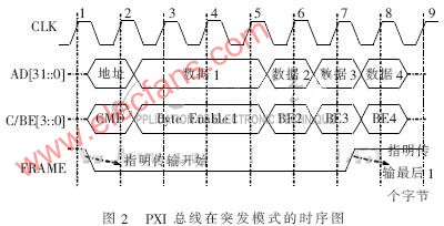 本系統(tǒng)采用的是突發(fā)讀寫模式,圖2為32位PXI總線在突發(fā)模式下的時(shí)序圖。