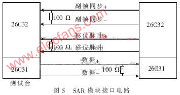 測(cè)量綜合控制器測(cè)試臺(tái)中SAR信號(hào)源模擬的是SAR壓縮器,采用標(biāo)準(zhǔn)RS-422-A接口形式傳輸壓縮后的圖像數(shù)據(jù)(每字節(jié)8位的串行數(shù)據(jù))。測(cè)量綜合控制器每隔25 ms向測(cè)試系統(tǒng)發(fā)送取數(shù)請(qǐng)求信號(hào),在取數(shù)請(qǐng)求由高變?yōu)榈脱舆t一段時(shí)間后,測(cè)量綜合控制器同時(shí)向測(cè)試臺(tái)發(fā)送移位脈沖,測(cè)試臺(tái)根據(jù)取數(shù)請(qǐng)求信號(hào)以及移位脈沖信號(hào),向測(cè)量綜合控制器發(fā)送相應(yīng)的數(shù)據(jù)信息,其接口電路如圖5所示。