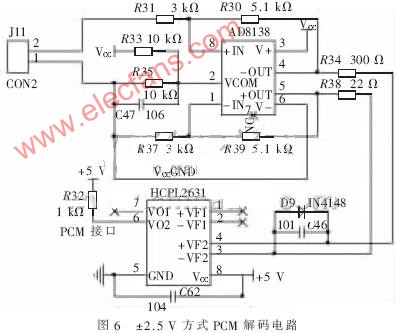 如圖6所示,系統(tǒng)首先通過(guò)AD8138將PCM數(shù)據(jù)轉(zhuǎn)換成幅值為0~5 V的電平(AD8138還有反相的功能)。為了將差分信號(hào)轉(zhuǎn)換為FPGA能夠處理的TTL電平,并且保證信號(hào)被有效隔離和再次反相,采用光電耦合器來(lái)接收差分信號(hào)。DC-DC實(shí)現(xiàn)了電源隔離,這樣系統(tǒng)能夠有效地實(shí)現(xiàn)與測(cè)量綜合控制器的隔離,從而消除傳輸干擾帶來(lái)的誤差。