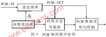 因?yàn)椤?.5 V方式只包含數(shù)據(jù)流,因此實(shí)時(shí)同步時(shí)鐘的產(chǎn)生是解碼的關(guān)鍵,也是串行傳輸要解決的主要問(wèn)題。PCM同步傳輸是以固定的節(jié)拍發(fā)送數(shù)據(jù)信號(hào)的,而且信號(hào)以恒定的速率(系統(tǒng)采用的是1.966 08 MHz)傳送數(shù)據(jù),因此在數(shù)據(jù)流中各碼元之間的相對(duì)位置是固定的。FPGA為了從轉(zhuǎn)換后的TTL電平串行數(shù)據(jù)中正確區(qū)分出信號(hào)碼元,必須先建立起準(zhǔn)確的時(shí)鐘信號(hào),即同步時(shí)鐘。從而使得發(fā)送方和接收方同步工作,即位同步。本設(shè)計(jì)中碼同步信號(hào)通過(guò)對(duì)clk的20分頻和對(duì)濾波后的PCM碼的提取得到。在副幀同步的邏輯設(shè)計(jì)中,采用了容錯(cuò)設(shè)計(jì)方法,即每1個(gè)副幀都判斷副幀或幀同步標(biāo)志。具體方法是:先找到1個(gè)EB 90或14 6F,然后每隔96個(gè)字節(jié)再判斷1次移位的數(shù)據(jù)是不是EB 90或14 6F,若不是,則重新查找;若是,則認(rèn)為它們是副幀或幀同步標(biāo)志,每1個(gè)副幀都進(jìn)行判斷。這樣查找的好處是:即使第1次誤判,也不會(huì)影響后續(xù)的判斷正確性;即使PCM碼發(fā)送中斷后再重發(fā),或由于干擾發(fā)送錯(cuò)誤,也不會(huì)影響后續(xù)的正確解調(diào)。這種循環(huán)判斷副幀或幀同步標(biāo)志的方法,增強(qiáng)了PCM碼解調(diào)過(guò)程的容錯(cuò)、糾錯(cuò)能力。PCM解碼程序框圖如圖7所示。
