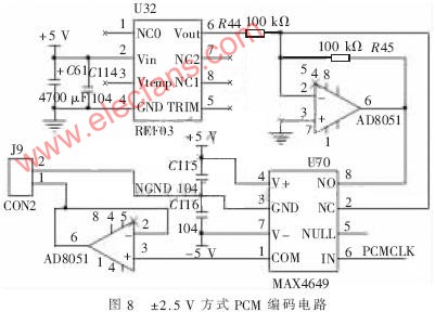 如圖8所示為PCM編碼電路,REF03通過(guò)調(diào)理電路輸出2.5 V和-2.5 V電壓。MAX4649是一個(gè)單刀雙擲開關(guān),F(xiàn)PGA控制PCMCLK信號(hào)來(lái)決定輸出的PCM碼流。