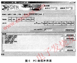 PC軟件利用串口 控件,通過(guò)串口對(duì)閱讀器發(fā)送相關(guān)命令,從而實(shí)現(xiàn)閱讀器的設(shè)計(jì),PC端程序界面如圖6所示,通過(guò)實(shí)驗(yàn),能準(zhǔn)確操作TypeB卡。