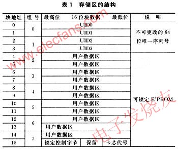 SR176卡256位存儲(chǔ)區(qū)分為8組,即16個(gè)塊,每塊16位;對(duì)SR176的數(shù)據(jù)存儲(chǔ)操作以16位為基本單位。存儲(chǔ)區(qū)的結(jié)構(gòu)如表1所列,存儲(chǔ)器的頭4個(gè)塊為卡片唯一的64位序列號(hào),不可更改。第4-14塊為17位、可鎖定E2PROM的用戶(hù)數(shù)據(jù)區(qū),用于應(yīng)用數(shù)據(jù)的存儲(chǔ)。