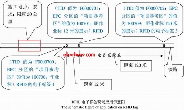 ??? ⑵對應其 EPC Bank的“項目參考區(qū)”分別設(shè)置為:100700、100701、100709(按編碼規(guī)則三個RFID 電子標簽分別代表作業(yè)標(100700)、距作業(yè)標(100701)12 米的提示、距作業(yè)標(100709)120 米的提示;⑶將注意事項:施工地點,限速50 公里寫入USER Bank 。