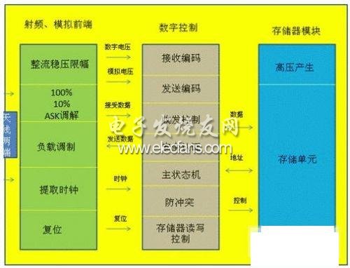 芯片按照功能和結(jié)構(gòu)特征劃分為射頻、模擬前端、數(shù)字控制,存儲(chǔ)單元三大模塊,系統(tǒng)結(jié)構(gòu)圖如下: