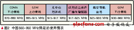 圖2顯示了中 國在860~960 MHz頻段的頻率使用現(xiàn)狀,920~925 MHz的RFID頻段實(shí)際上是立體聲廣播點(diǎn)對點(diǎn)傳輸業(yè)務(wù)頻段分出5 MHz與RFID共用,與GSM上/下行頻段只有5 MHz的頻率間隔,與無中心對講機(jī)系統(tǒng)只有3 MHz的頻率間隔。