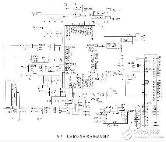 R1000與W78E365的連接見圖3。射頻信號經(jīng)天線進入電橋,輸出信號被分為兩路,一路信號經(jīng)過帶通濾波器和不平衡到平衡的轉(zhuǎn)換進入R1000的射頻輸入口。另一路信號經(jīng)不平衡到平衡的轉(zhuǎn)換進人R1000的本振輸入口。這兩路信號在R1000內(nèi)部經(jīng)過解調(diào)和模/數(shù)轉(zhuǎn)換等一系列操作后,將所得的數(shù)字信息送給W78E365。W78E365對收到的信號經(jīng)解碼和校驗,將所得信息送往上位機,并將其對R1000的命令編碼和加密后發(fā)送給R1000。這些命令在R1000內(nèi)部經(jīng)過調(diào)制和PA,再經(jīng)過平衡到不平衡的轉(zhuǎn)換和濾波,由天線發(fā)射出去。數(shù)字模塊中的時鐘驅(qū)動來自于外部TCXO產(chǎn)生的24 MHz參考頻率。系統(tǒng)中通過∑-△DACS的信號頻率為24 MHz;通過∑-△ADCS的信號頻率為48 MHz。