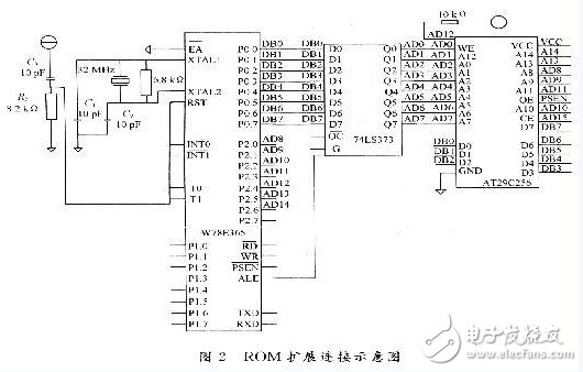 W78E365內(nèi)部ROM僅64 KB,內(nèi)存太小,故采用AT29C256作為外擴ROM。線路連接見圖2。
