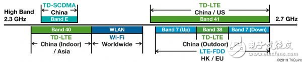 在大陸,其指定采用的LTE技術(shù)是分時(shí)多工,而非北美洲所用的分頻多工。許多LTE頻段分布于高頻帶,包括許多鄰接Wi-Fi的頻段。此一狀況產(chǎn)生了對BAW Wi-Fi共存濾波器的強(qiáng)烈需求。例如圖三所示,可以發(fā)現(xiàn)位于頻段40與41的兩個(gè)緊鄰的LTE分時(shí)多工頻道。(請參照圖三)。