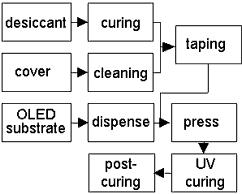封裝工藝之流程如圖四所示,為了將Desiccant置於蓋板及順利將蓋板與基板黏合,需在真空環(huán)境或?qū)⑶惑w充入不活潑氣體下進(jìn)行,例如氮?dú)?。值得注意的是,如何讓蓋板與基板這兩部分工藝銜接更有效率、減少封裝工藝成本以及減少封裝時(shí)間以達(dá)最佳量產(chǎn)速率,已儼然成為封裝工藝及設(shè)備技術(shù)發(fā)展的3大主要目標(biāo)。
