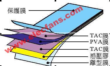 高分子膜在經(jīng)過(guò)延伸之后,通常機(jī)械性質(zhì)會(huì)降低,變得易碎裂。所以在偏光基體(PVA)延伸完后,要在兩側(cè)貼上三醋酸纖維(TAC)所組成的透明基板,一方面可做保護(hù),一方面則可防止膜的回縮。此外,在基板外層可再加一層離型膜及保護(hù)膜,以方便與液晶槽貼合(如圖十三)。