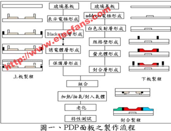商品化的AC型PDP基本結構是由富士通公司在1996年所確立的,其基本制程可簡單的分為上板制程與下板制程以及封合、組裝制程(圖一)。