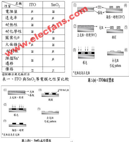如圖一所示,在上板制程中首先要在玻璃基板上制作透明電極。目前有兩種;ITO或SnO2。ITO或SnO2在性質上有所差異(表一),ITO在耐熱性與抗蝕性較差且成本較高,但透光率與導電性較佳。一般整面透明電極的制作是由玻璃廠商代工,若是ITO導電膜所采用的制程是以薄膜制程的物理濺鍍法(sputtering)為主,然後以濕式蝕刻方式將ITO蝕刻成所需之透明電極圖案(pattern)( 圖二a)。而SnO2透明電極則因為是以CVD制程為主,其Pattern是以半導體lift-off的制程制作(圖二b),需由面板廠商自行制造,這對面板廠商而言是多了一項制程反而會造成困擾。因此大多PDP面板制造商以購買ITO玻璃基板,再蝕刻ITO pattern為主。