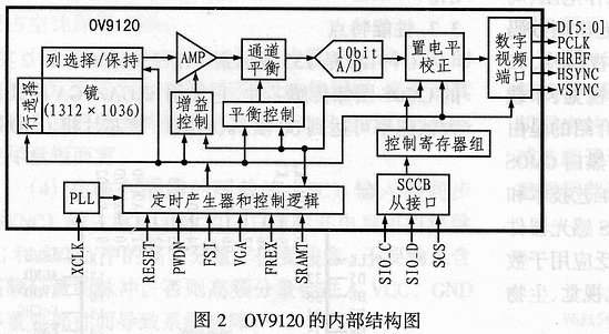 OV9120內(nèi)置1312×1036分辨率的鏡像陣列、10位A/D轉(zhuǎn)換器、可調(diào)視頻窗、SCCE接口、可編程幀速率控制、可編程/自動曝光增益控制、內(nèi)外幀同步、亮度均衡計(jì)數(shù)器、數(shù)字視頻端口、定時(shí)產(chǎn)生器、黑電平校準(zhǔn)及白平衡控制等電路。其內(nèi)部結(jié)構(gòu)如圖2所示。