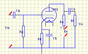 式中,fL放大器的下限頻率,一般取20Hz,Rg為柵極偏置電阻的值,計(jì)算Ca時(shí),Rg為后面一級(jí)電子管的柵極偏置電阻的值。陰極電阻Ck則可用下式估算: