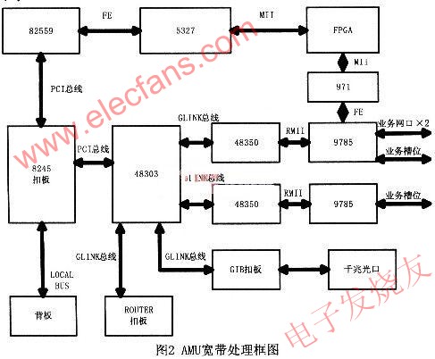 寬帶數(shù)據(jù)部分CPU系統(tǒng)采用Motorola的8245CPU系統(tǒng),對外提供一個32位的PCI接口和LOCALBUS接口。PCI總線可支持5個設(shè)備,8245通過PCI總線可對GALILEO48303進(jìn)行配置,再通過GALILEO公司定義的GUNK總線實(shí)現(xiàn)對各業(yè)務(wù)網(wǎng)口、上行千兆光口、路由模塊的數(shù)據(jù)交換。AMU單板總體框圖如圖1。