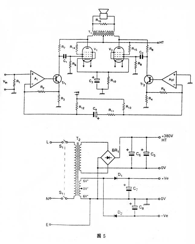 從V1和V2來(lái)的輸出電壓加到Tl的初級(jí)線圈上,而高壓則通過(guò)T1初級(jí)的中心抽頭加到電子管上。音頻輸出信號(hào)取自Tl的次級(jí)線圈而加到揚(yáng)聲器上。電阻R16保證在未加適當(dāng)負(fù)載時(shí),輸出級(jí)不致失控。
