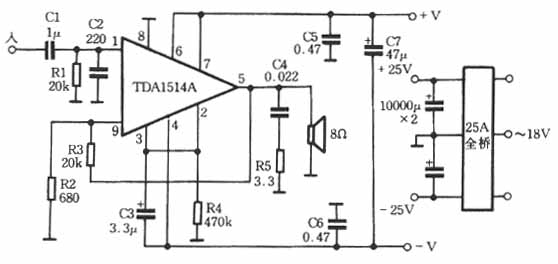 TDA1514A是大家熟悉的優(yōu)質(zhì)功放IC。若按圖5-55所示的改進后電路,可以制作出一臺高保真功率放大器。由于采用了