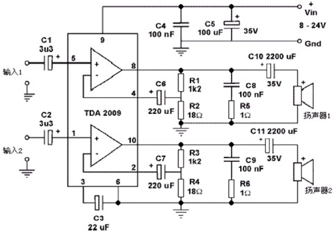 本文介紹了TDA2009功率放大器應(yīng)用線路圖最高工作電源電壓28V,輸出功率2×10W 典型工作電源電壓24V,正常工作電壓8-28V正常工作電壓就是指在這個(gè)范圍內(nèi)都可正常工作集成電路給出的諸多參數(shù)就是按典型工作電壓測(cè)試的。