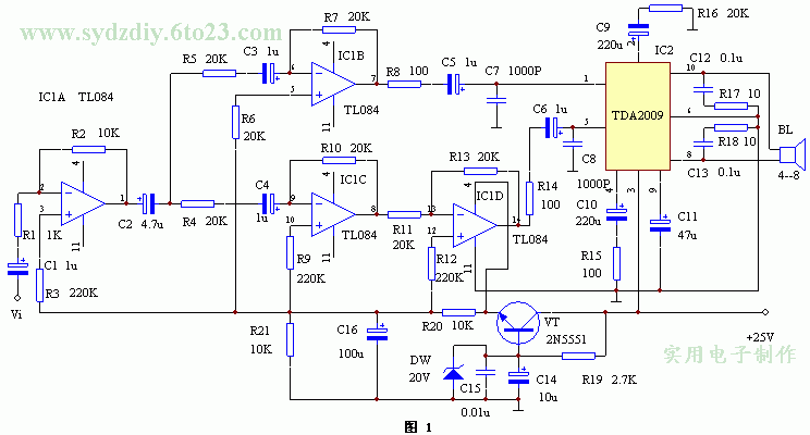 由TDA2009構(gòu)成的1W高保真BTL功率放大器