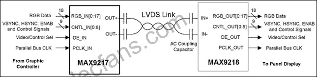 MAX9217/MAX9218芯片組是一個收發(fā)器對兒,發(fā)送器(MAX9217)將并行數(shù)據(jù)轉(zhuǎn)換成串行數(shù)據(jù),發(fā)送給接收器(MAX9218);接收器再將串行數(shù)據(jù)轉(zhuǎn)換成并行數(shù)據(jù)。該芯片組設(shè)計用于通過一對