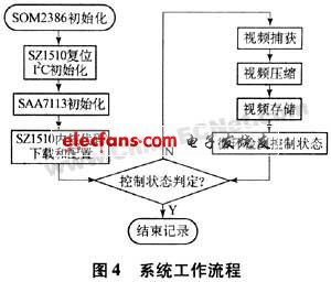 系統(tǒng)的所有軟件程序做成一個(gè)批處理文件,存儲(chǔ)與控制模塊som2386上虛擬軟盤的一指定目錄中,系統(tǒng)上電后自動(dòng)運(yùn)行此目錄下的程序,控制系統(tǒng)的工作。系統(tǒng)上電后,整個(gè)系統(tǒng)的工作流程如圖4所示。