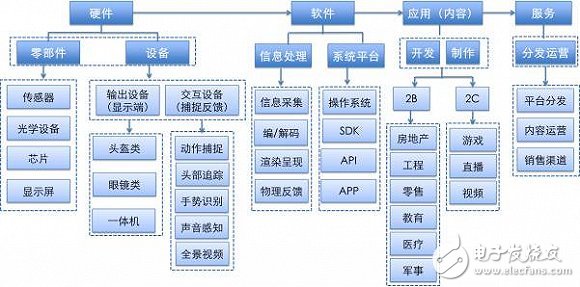 VR 產(chǎn)業(yè)鏈較長,參與廠商眾多,涵蓋硬件、系統(tǒng)、平臺、開發(fā)工具、內(nèi)容以及內(nèi)容運營銷售等。作為一個尚處于萌芽期的產(chǎn)業(yè),其每個環(huán)節(jié)都存在較多的競爭者以及潛在進入者。國內(nèi)廠商大多集中在產(chǎn)業(yè)鏈前半部分,尤其在硬件領(lǐng)域較為集中,而在內(nèi)容、開發(fā)平臺、軟件及周邊產(chǎn)業(yè)等領(lǐng)域基本處于空白。