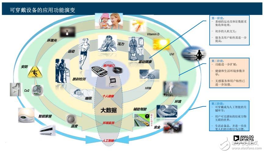 ADI的王勝則認(rèn)為可穿戴設(shè)備市場(chǎng)要經(jīng)歷三個(gè)發(fā)展階段,第一個(gè)階段是目前的階段,就是簡(jiǎn)單的運(yùn)動(dòng)健康管理,第二階段除了功能進(jìn)一步增強(qiáng)外,還會(huì)增加健康和生活環(huán)境參數(shù),并和自身數(shù)據(jù)進(jìn)行融合,增強(qiáng)用戶粘性;第三階段則是把大數(shù)據(jù)和人工智能和可穿戴設(shè)備結(jié)合,通過人工智能真正實(shí)現(xiàn)了無感式的控制采集和處理。