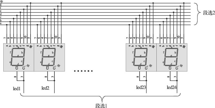 若LED為共陽型,段選2的控制信號先使a段為低電平,其余b、c、d、e、f、g、dp段全為高電平,這樣led1、led2....led23、led24是否要點亮其中的a劃還要受段選1的控制,段選1又是由待顯示的數(shù)據(jù)控制,然后段選2的控制信號再輪流使b、c、d、e、f、g、dp為低電平,依次掃描,即每個字是一筆一筆受控是否需要點亮,這樣只要8次循環(huán),就可完成一次顯示,而不必考慮接入LED的個數(shù)。如要顯示3個數(shù)字為1、2、3(led1、led2、led3),則加入的控制信號見表1,共陽型字符表見表2。