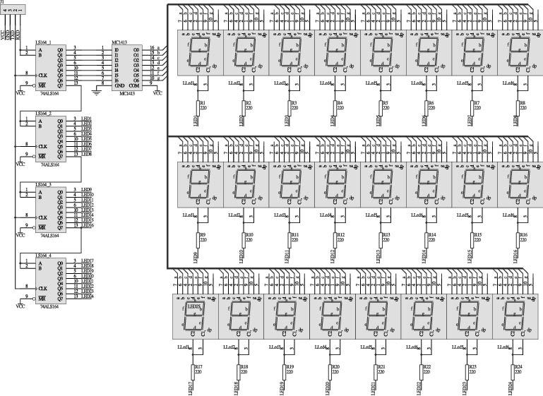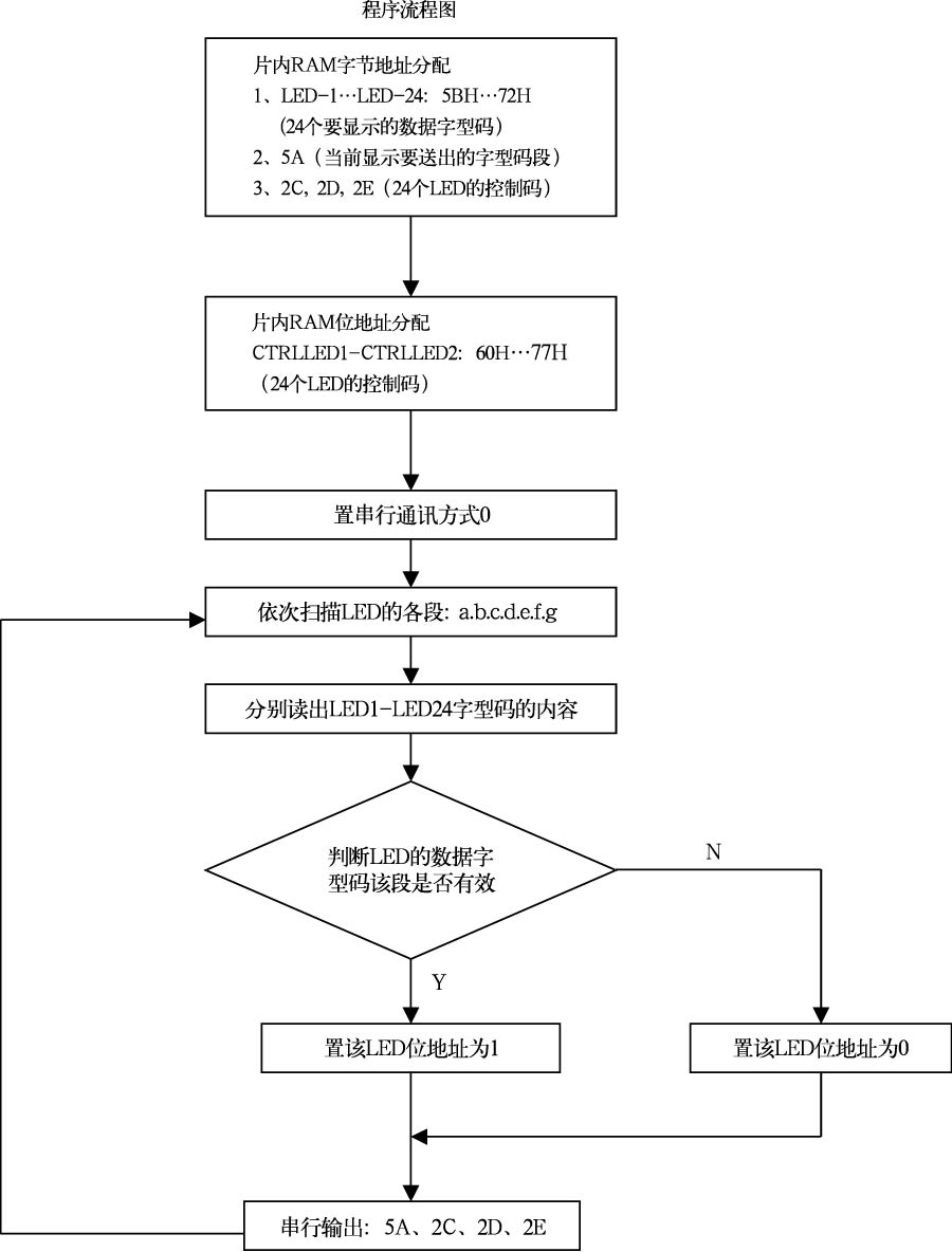 某項目控制系統(tǒng)需要顯示24個數(shù)字,考慮到單片機I/O資源有限,按常規(guī)方法必需擴展I/O,這樣就使電路復(fù)雜又增加了硬件成本,能否以軟代硬就成為設(shè)計的關(guān)鍵所在。圖3所示的電路中采用上面介紹的方法,用軟件方式顯示24個數(shù)字,電路采用了4片74LS164,1片MC1413(ULN2003),單片機只需通過RXD、TXD就可控制顯示,軟件流程圖如圖4所示。