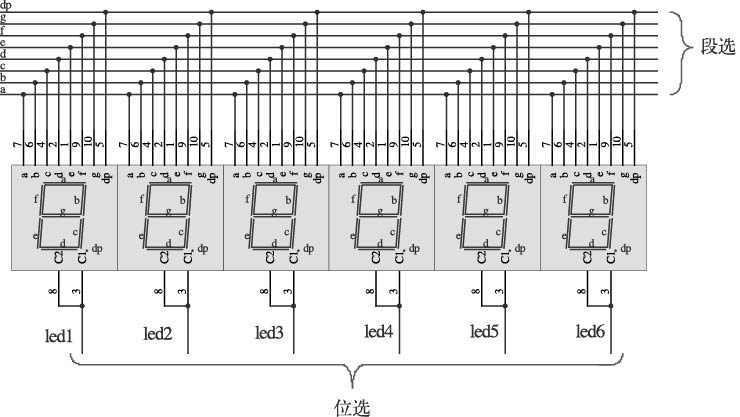 單片機應(yīng)用系統(tǒng)中常使用LED作為顯示器,在需多位LED顯示時,為了簡化電路,降低成本,常將所有門的選線并聯(lián)在一起,由一個8位I/O口控制,而共陰(陽)I/O線受控制,實現(xiàn)各部分時選通。如圖1所示為6位LED動態(tài)顯示接口電路。