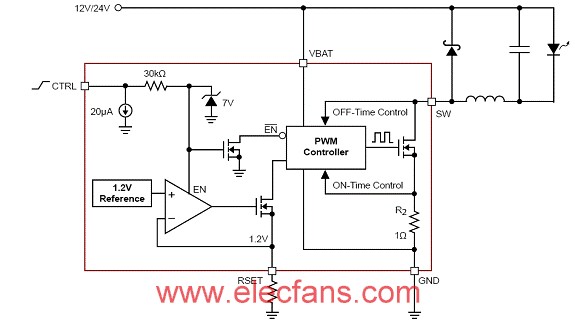 由于 LED 發(fā)射的光與通過(guò) LED 的平均電流成正比, CCR 同樣也提供調(diào)節(jié)光輸出的能力。通過(guò)模擬或數(shù)字脈寬調(diào)制 (PWM) 技術(shù)提供調(diào)光。模擬方法注入模擬信號(hào)至反饋電壓,從而使平均輸出電流減小。數(shù)字方法使用輸入 PWM 信號(hào)來(lái)抑制穩(wěn)壓器的開(kāi)關(guān),并降低平均輸出電流。典型調(diào)光頻率介于 200 Hz 與 1,000 Hz 之間,因?yàn)槿搜鄄荒懿煊X(jué)頻率高于 100 Hz 時(shí)的細(xì)微變化。