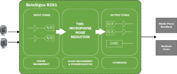 在我們生活中,常常被外面的汽車,建筑工地等嘈雜聲煩擾,工作中,會議經(jīng)常被各種人為或機器噪聲所中斷,這使得我們常用的電子產(chǎn)品如手機,平板電腦等,更加迫切需求強大的消噪功能來摒除這些外界的干擾。針對這類產(chǎn)品的需求,安森美公司近期推出了用于消費電子的完備系統(tǒng)級芯片方案——BelaSigna-R261。 該方案集成了高度優(yōu)化的數(shù)字信號處理器(DSP)與先進的雙麥克風降噪算法,能夠顯著提升嘈雜環(huán)境下的語音清晰度,同時保持語音自然清晰。