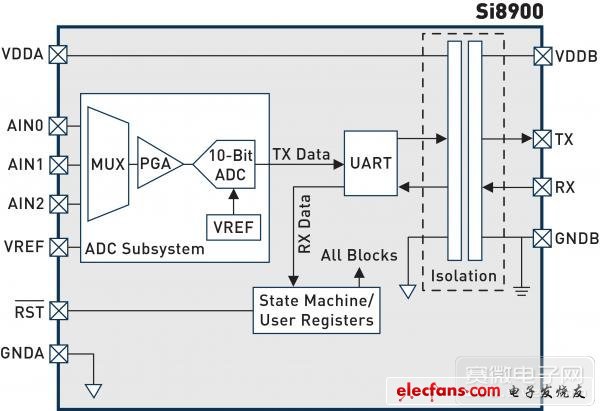 Si890x系列產品提供3個串行通信接口選項:UART、I2C和SPI。靈活的接口選擇使開發(fā)人員能充分利用現(xiàn)有系統(tǒng)通信端口,方便的集成到系統(tǒng)設計中,同時也讓開發(fā)人員在不改變其系統(tǒng)控制器的情況下,快速的連接到隔離型ADC。此外,SPI端口選項為帶寬敏感型應用提供高達2.5Mbps數(shù)據(jù)吞吐量。