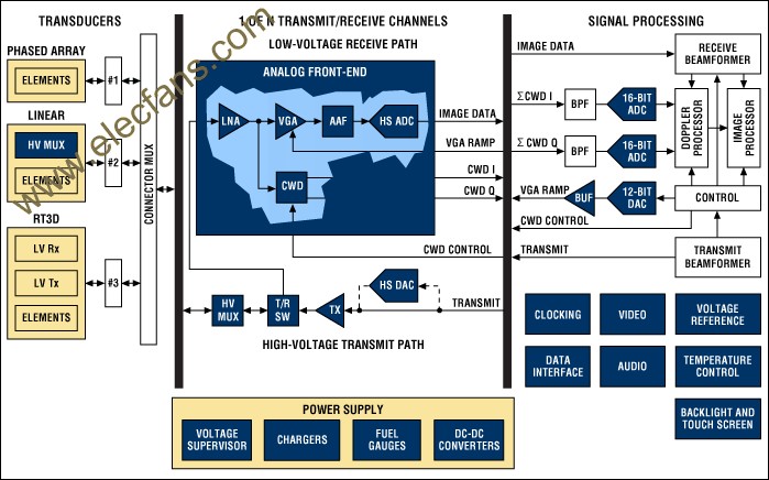 摘要:該應(yīng)用筆記介紹了超聲成像系統(tǒng)的設(shè)計(jì)考慮,討論成像系統(tǒng)的小型化、低成本和便攜化的發(fā)展趨勢(shì),同時(shí)闡述了在小型系統(tǒng)中實(shí)現(xiàn)大型車(chē)載系統(tǒng)所具備的性能和診斷能力的重要條件。文章探討了超聲系統(tǒng)的子功能以及對(duì)電子元件的要求,重點(diǎn)討論了傳感器、高壓復(fù)用器、高壓發(fā)射機(jī)、成像通道接收機(jī)、數(shù)字波束成形、波束成形數(shù)字信號(hào)處理及顯示處理等。