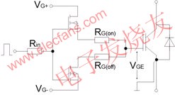 柵極驅(qū)動電路的驅(qū)動器輸出級是一種典型的設(shè)計(jì),采用了兩個按圖騰柱形式配置的MOSFET,如圖3所示。兩個MOSFET的柵極由相同的信號驅(qū)動。當(dāng) 信號為高電平時,N通道MOSFET導(dǎo)通,當(dāng)信號為低電平時,P通道MOSFET導(dǎo)通,從而產(chǎn)生了兩個器件推挽輸出的配置。MOSFET的輸出級可有一路 或兩路輸出。據(jù)此可實(shí)現(xiàn)具有一個或兩個柵極電阻(導(dǎo)通,關(guān)斷)的用于對稱或不對稱柵極控制的解決方案。