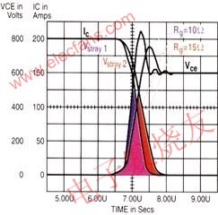 IGBT開關(guān)特性的設(shè)定可受外部電阻RG的影響。由于IGBT的輸入電容在開關(guān)期間是變化的,必須被充放電,柵極電阻通過限制導(dǎo)通和關(guān)斷期間柵極電流 (IG)脈沖的幅值來決定充放電時間(見圖1)。由于柵極峰值電流的增加,導(dǎo)通和關(guān)斷的時間將會縮短且開關(guān)損耗也會減少。減小RG(on)和 RG(off)的阻值會增大柵極峰值電流。當(dāng)減小柵極電阻的阻值時,需要考慮的是當(dāng)大電流被過快地切換時所產(chǎn)生的電流上升率di/dt。電路中存在雜散電 感在IGBT上產(chǎn)生大的電壓尖峰,這一效果可在圖2所示的IGBT關(guān)斷時波形圖中觀察到。圖中的陰影部分顯示了關(guān)斷損耗的相對值。集電極-發(fā)射極電壓上的 瞬間電壓尖峰可能會損壞IGBT,特別是在短路關(guān)斷操作的情況下,因?yàn)閐i/dt比較大??赏ㄟ^增加?xùn)艠O電阻的值來減小Vstray。因此,消除了由于過 電壓而帶來的IGBT被損毀的風(fēng)險??焖俚膶?dǎo)通和關(guān)斷會分別帶來較高的dv/dt和di/dt,因此會產(chǎn)生更多的電磁干擾(EMI),從而可能導(dǎo)致電路故 障。表1顯示不同的柵極電阻值對di/dt的影響。