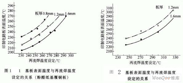 再流焊設定溫度與PCB表面溫度是有所差別。而在相同的再流焊設定溫度下,由于基板材料類型和厚度的不同,其PCB表面溫度也有所不同(見圖1和圖2)。