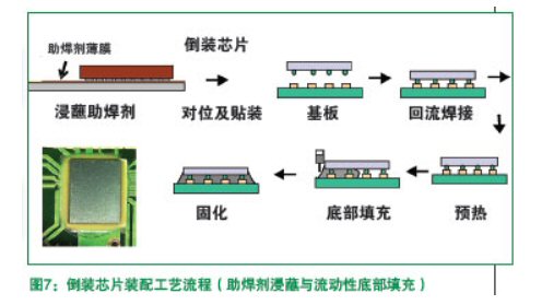 相對(duì)于其它的IC器件,如BGA、CSP等,倒裝芯片 裝配工藝有其特殊性,該工藝引入了助焊劑工藝和底部填充工藝。因?yàn)橹竸埩粑铮▽?duì)可靠性的影響)及橋連的 危險(xiǎn),將倒裝芯片貼裝于錫膏上不是一種可采用的裝配方法。業(yè)內(nèi)推出了無(wú)需清潔的助焊劑,芯片浸蘸助焊劑工藝成為廣泛使用的助焊技術(shù)。目前主要的替代方法是使用免洗助焊劑,將器件浸蘸在助焊劑薄膜里讓器件焊球蘸取一 定量的助焊劑,再將器件貼裝在基板上,然后回流焊接;或者將助焊劑預(yù)先施加在基板上,再貼裝器件與回流焊 接。助焊劑在回流之前起到固定器件的作用,回流過(guò)程中起到潤(rùn)濕焊接表面增強(qiáng)可焊性的作用。